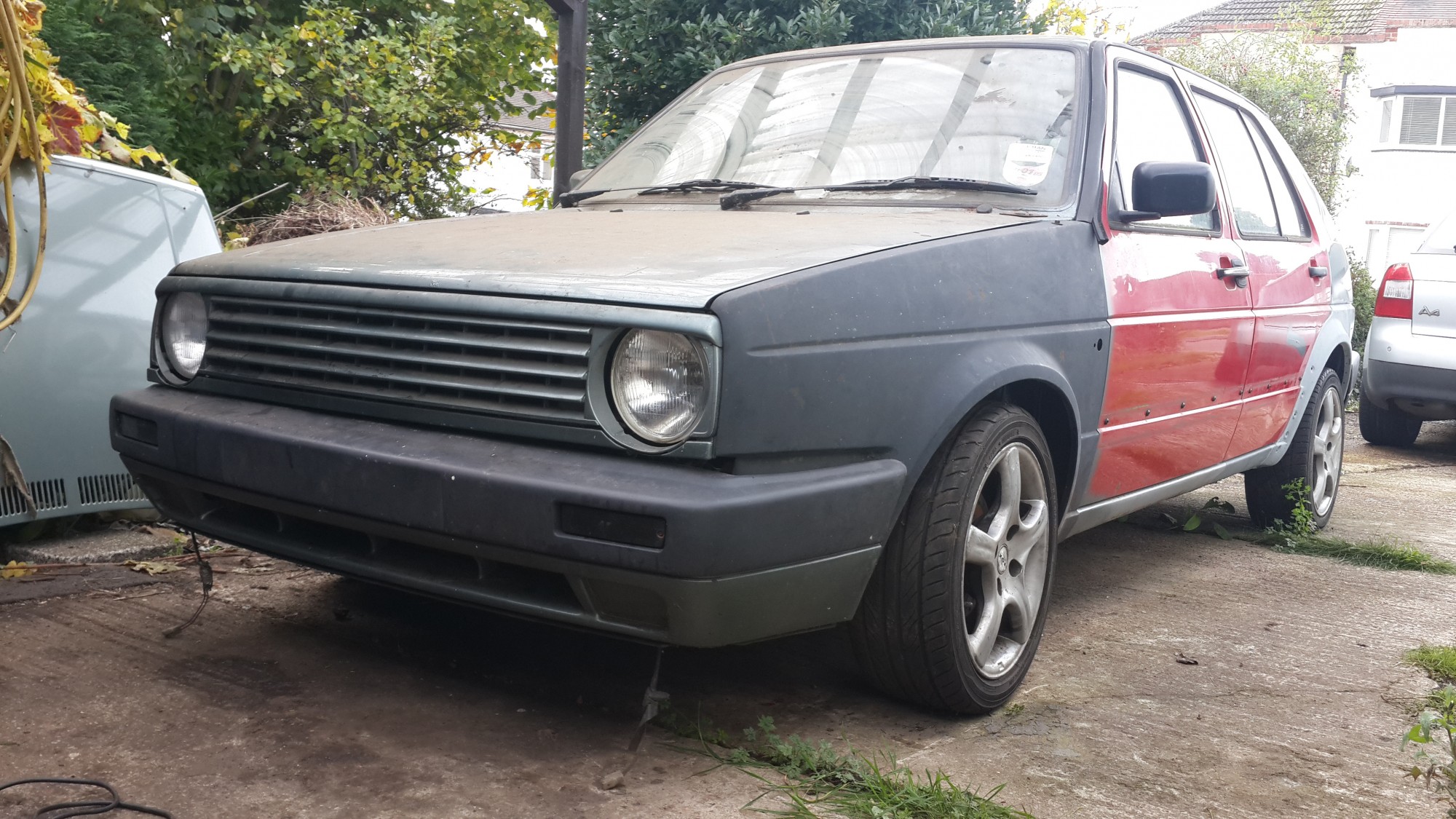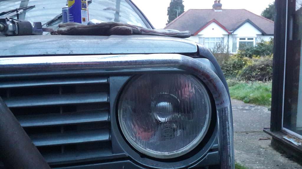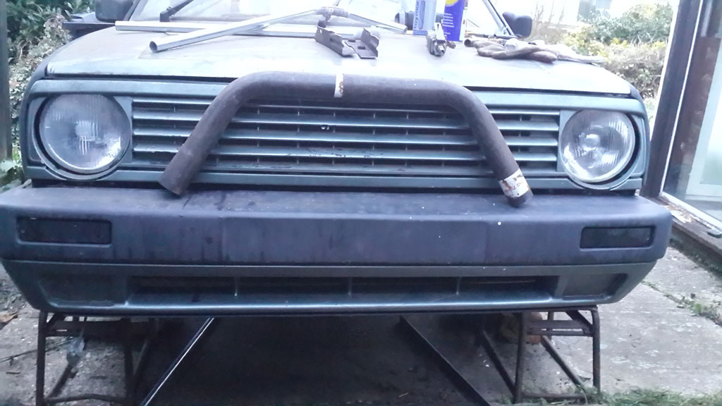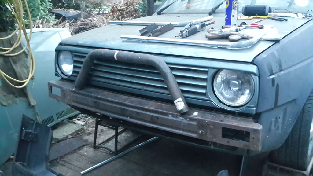 The bumper itself is a wee bit flimsy for my liking, especially as I would like to add a lower section too to protect the sump etc, but I’m thinking if the frame rails are the same distance apart at the front as they are at the back, I might be able to use the ‘girder’ part of another mk2 golf towbar minus the actual towbar bit and mount everything onto that, inside the metal part of the bumper. That should solidify things nicely at the front and provide a secure mounting for upper and lower sections of the bars too.